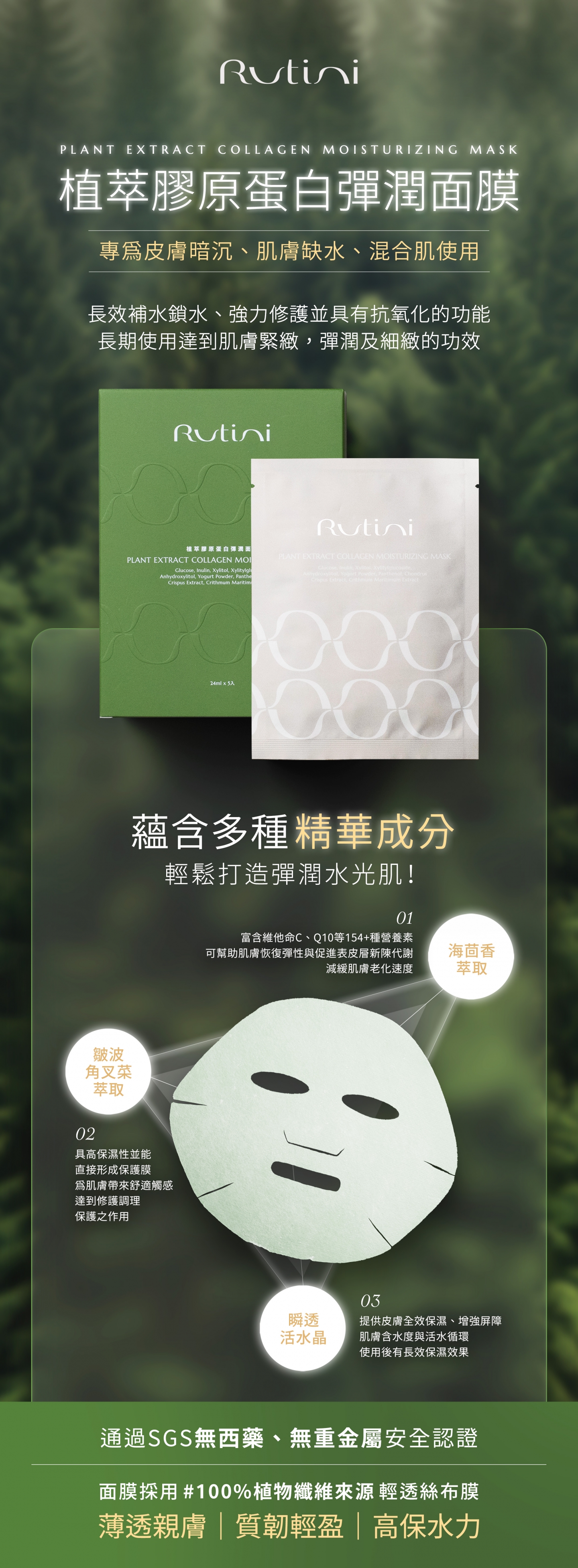 植萃膠原蛋白彈潤面膜植萃膠原蛋白彈潤面膜專為「皮膚暗沉」、「肌膚缺水」、「混和肌」打造長期肌膚緊緻與彈潤01海茴香萃取富含多種維他命,可調理肌膚油水平衡,維持健康膚況,延遲老化。02皺波角叉菜萃取優越的保濕特性,可增加肌膚的彈性和緊緻感!並能藉其活性撫平細紋。03瞬透活水晶建構肌膚保水機制,維持水潤狀態, 且多效合一,增強肌膚屏障。